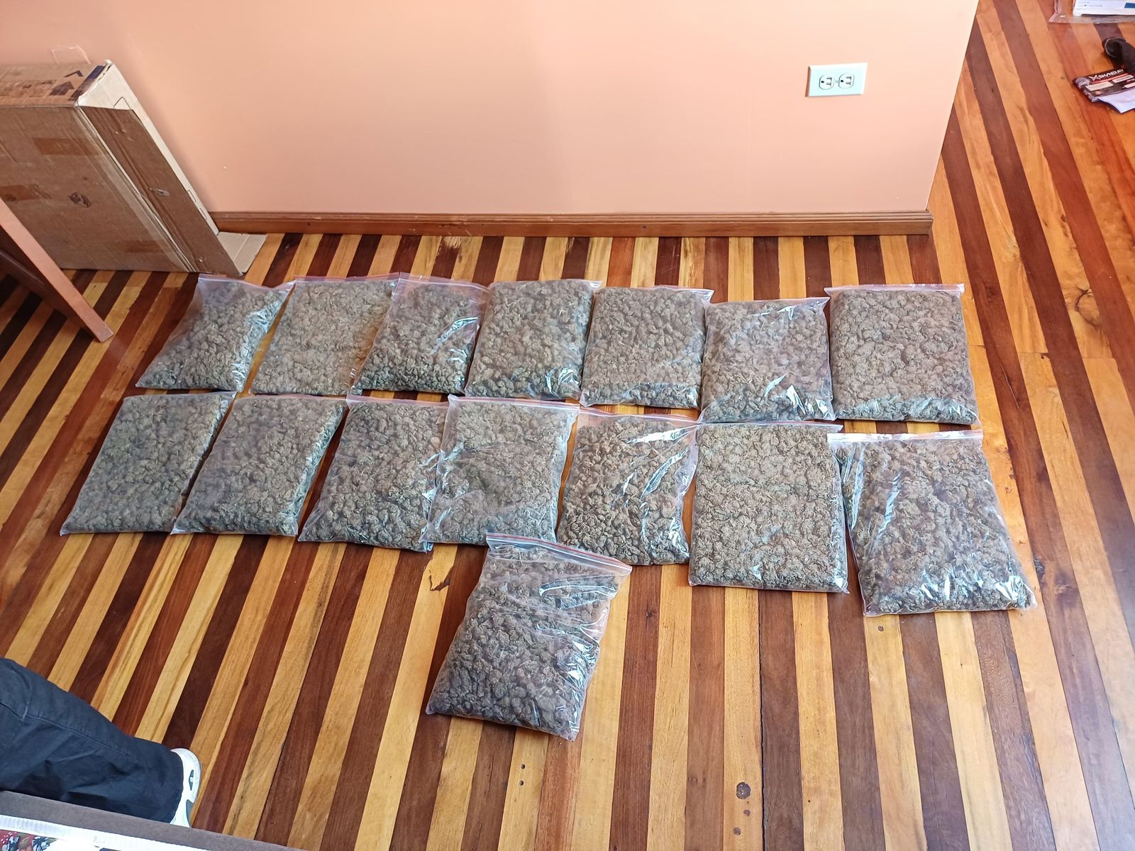 El registro fue directo. En una habitación aparecieron varias fundas plásticas con una sustancia vegetal. No estaban a la vista, pero tampoco bien ocultas. Tras las pruebas, el resultado fue claro: marihuana. El peso total superaba los 7 kilos.