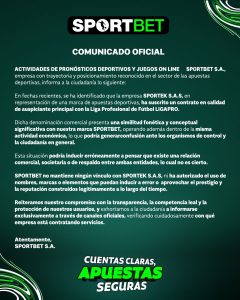La empresa ecuatoriana SPORTBET S.A., con trayectoria en el sector de pronósticosdeportivos, informa a la opinión pública que no mantiene...
